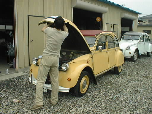 いつものガレージの外では2CVのグリルの交換をやっていました、プラスチック製からアルミ製に交換です。