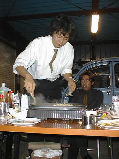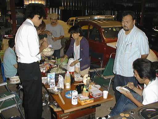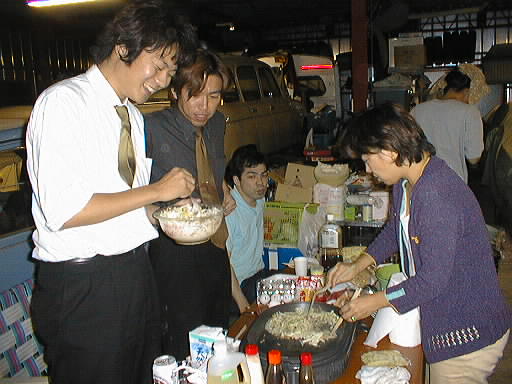 昨日に引き続きガレージでの「お好み焼き対決」です。某プジョー106乗りとその友人での対決、夕方材料費等で5千円も使ってのイベントでした。 焼き上がった「お好み焼き」を食べて評価している人々 作成風景、肉、キャベツ、海老、ソバ....その他色々 料理する人 負けた人が材料費を全部払ったかどうかは不明です。