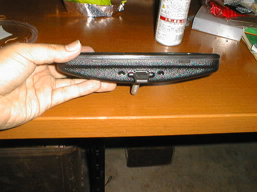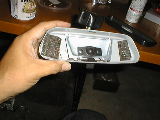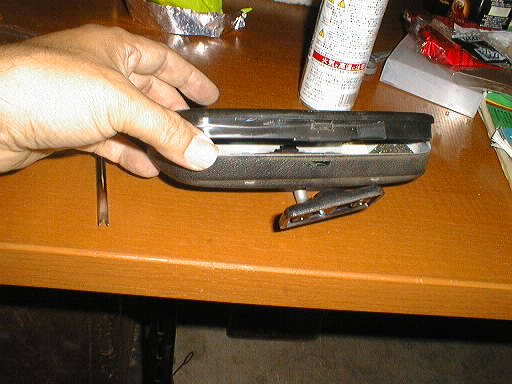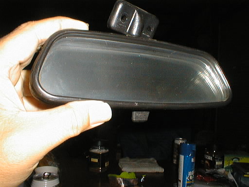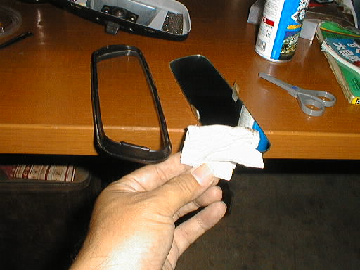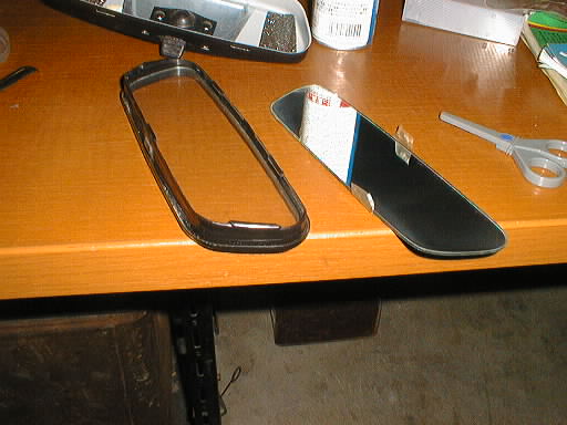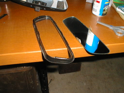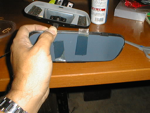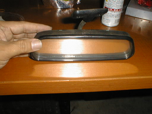 外したミラーアッセンブリーです、ガラス(鏡)の切断面で手を切らないように注意してください、周りの柔らかい樹脂の鏡を固定している所を起こして注意しながら鏡を取ります
