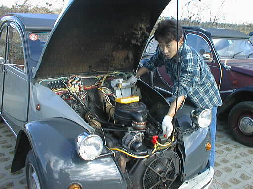かかりが悪い2CVを整備する人(配線オタクの某氏)