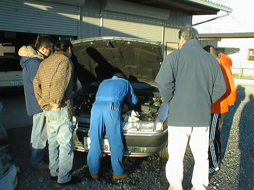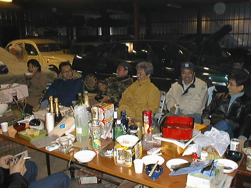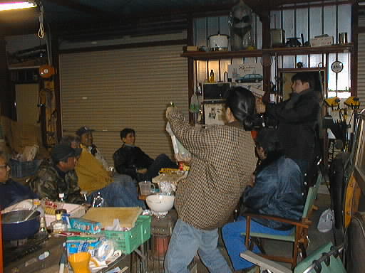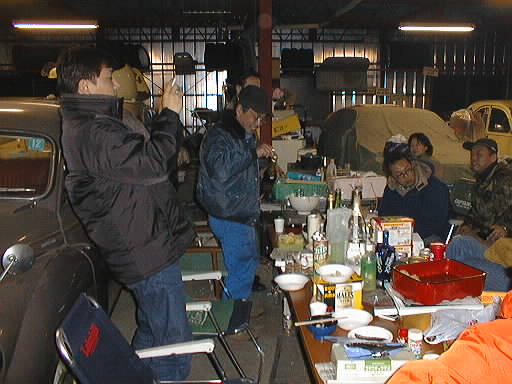 日も暮れ、集まってきた人たち、ガレージは暗い(笑)