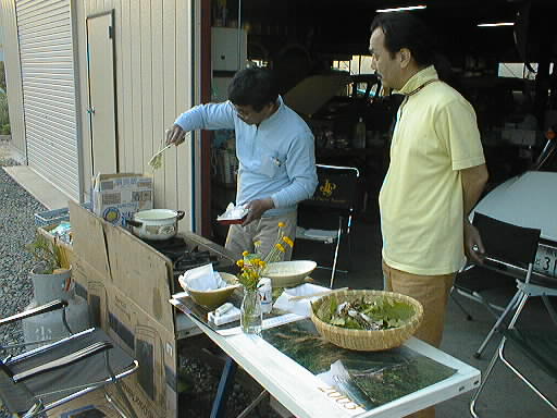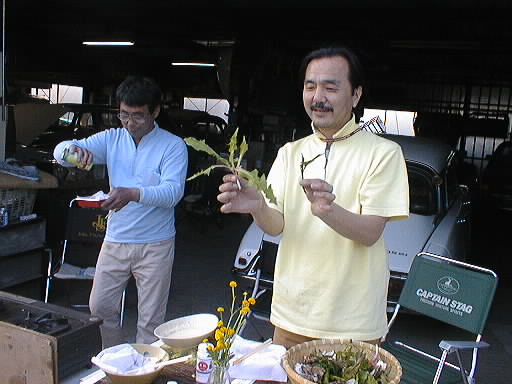 北上♪いつものガレージに着くと何やら準備中、少し遅いけど春の恵みを食そうと天ぷらの準備中でした。近所に自生している野草+近くのスーパーで買ってきた色々を揚げるみたいです。