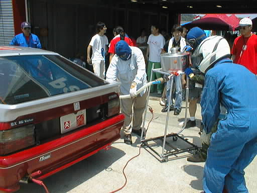 ガソリン給油の様子、後で解った事だが規定では20L以下の給油タンクなのに実際は18.4Lしか入らない給油タンクだったらしい、規定上は問題無いのだが一回の給油で1.6L入ら無いので、どこかで合わなくなる原因が後で解った(笑)