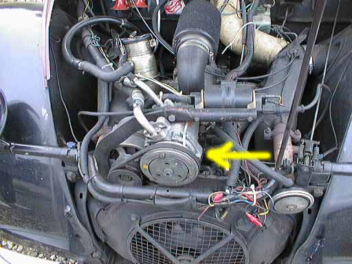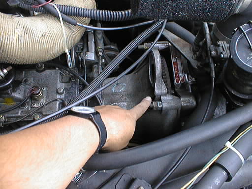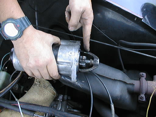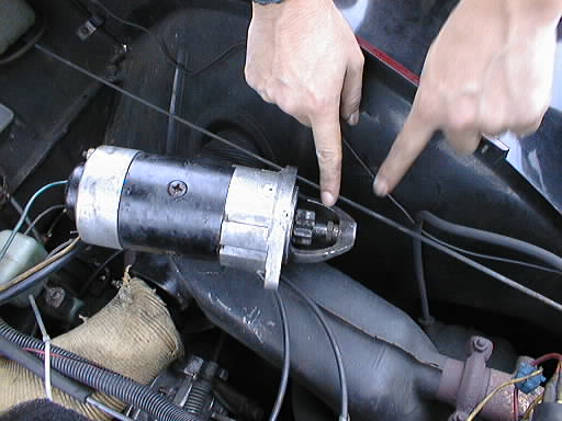 指で指している部分のボルト(2本有ります)を外してセルモーターを外しま