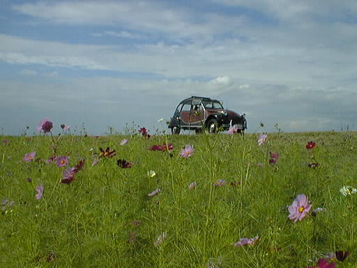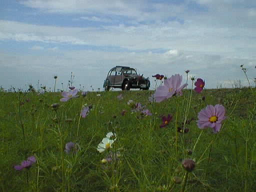 全長3Km以上有るコスモス街道で一休みしている2CV