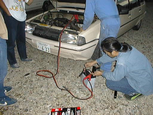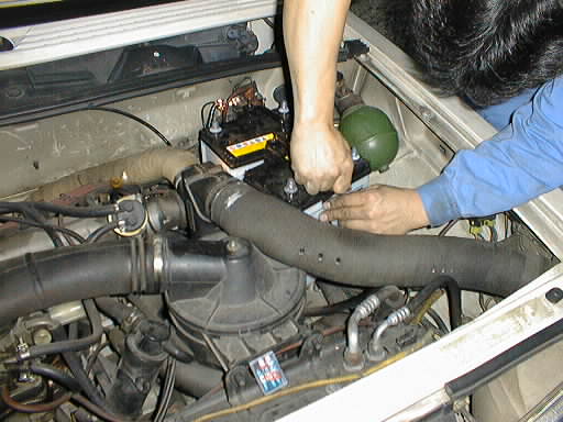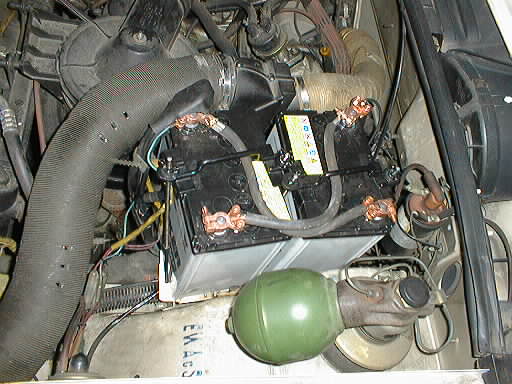 オリジナルのバッテリーを国産の3980円の安売り2個使いに換装する 小さいバッテリー2個でかかるか試験(と言うことにしておこう) ジャンプさせるケーブルは他のクルマの流用か? 端子はホームセンタ/カーショップの国産汎用品で制作、留め金もバッテリー に合わせて買った物らしい、ただしバッテリーの位置に合わせて止め金具の固定 穴を開ける必要があるそうです、これで国産バッテリー2個使い格安版の出来上 がりです