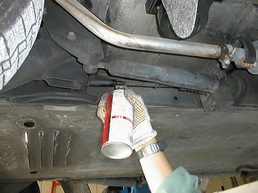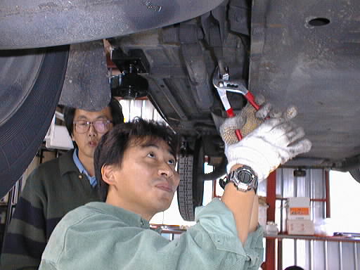 リフトで車を上げて見えにくいですがプライヤーでネジを切って有るシャフト