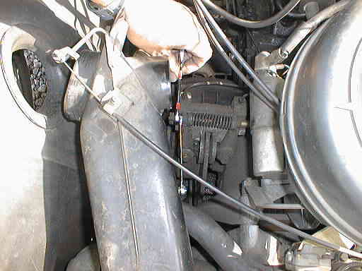 ヒートエクスチェンジャーの下のディスクブレーキの所にコイルバネが見えます、このスプリングの端に微調整用ナットが付いています、ダブルナット(ナットを2個使ってロックされてます)を11mmスパナを2本使って緩めます、写真は調整前のスパナを掛けた所