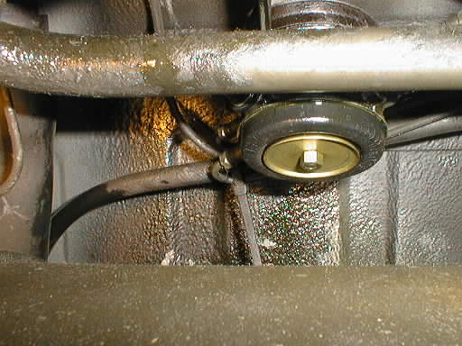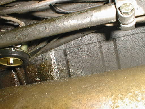 車高を上げてウマに乗せて車高を最低にしてから下にもぐり込みます、写真は上が前方で黒いゴム(よく見るとヒビヒビ)のところがハイトコレクターです、ネコ・パブリッシングのTipoの98年5月号の「BOLTS AND NUTS」(作:田中むねよし)でも書かれていますがマフラーが邪魔になるので出来れば外した方が良いのですがウチのマフラーも腐りかけてるのでそのままで作業しました