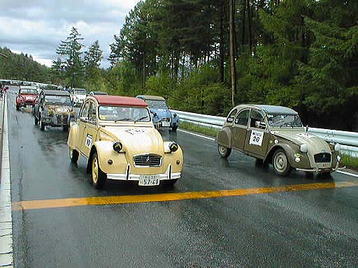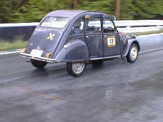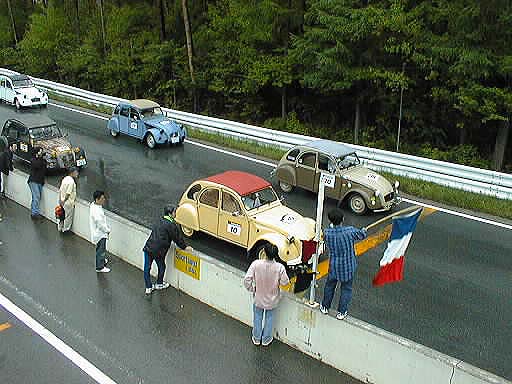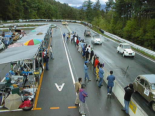 この写真で路面の状態が解るかな? 豊橋からの参加で楽しめましたか? 登り坂を全開バリバリで(笑)ゆっくり走る2CV 「目くそ鼻くそカップ」のスタート前のグリッティング、ウチらのチームは「くじ引き」で2ndポールポジションに、その後ろには「サビサビスマイル」が居る さて、フランス国旗でスタートです 数周回ってきたらすでに5番手まで落ちてました(^^; だって、安全運転だもん(笑) 鯖?のページに戻る