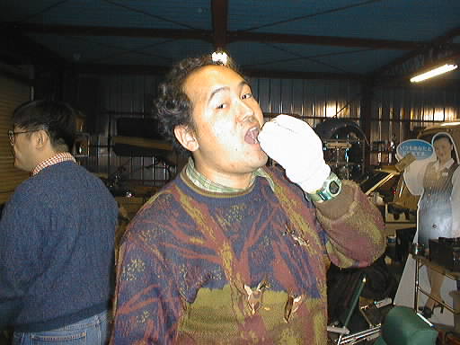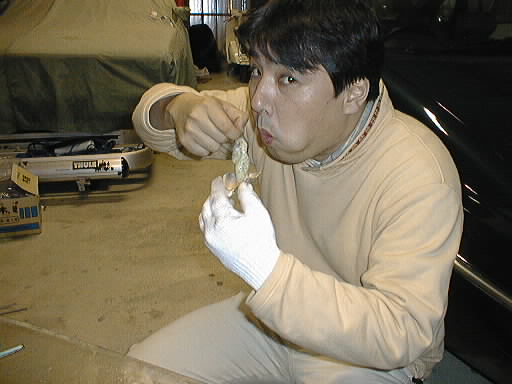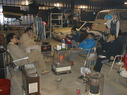 焼けるまでくつろぐ人達、ストーブの数がガレージの寒さを語ってます