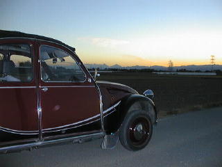 まず、日が暮れるのを待ってから出陣です、2CVのボンネットの上あたりに遠く富士山が見えます