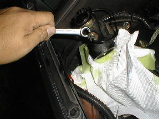 すでにフロントスフィアは外されていた、今は配管を外す為に「フレアナットレンチ」を使って外しているところ
