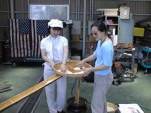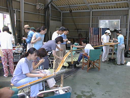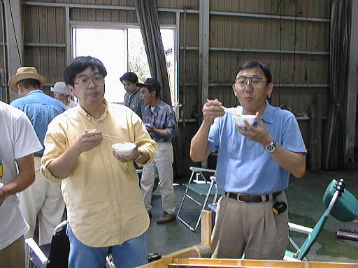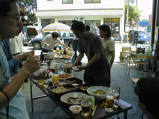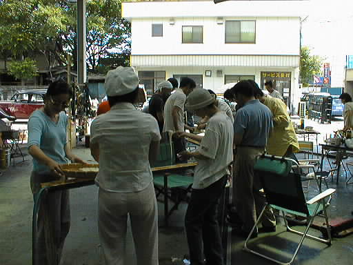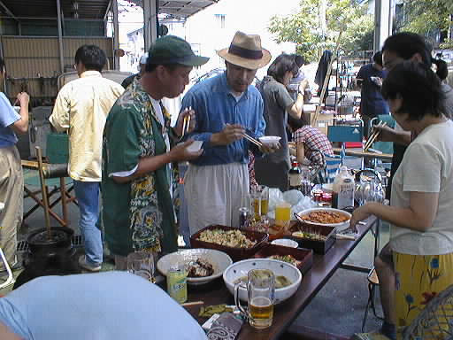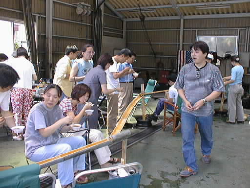 流し素麺大会に行きました(1999.07.10) 白根自動車で流し素麺大会を行うとの情報にお出かけしてきました 当日は40人以上参加してワイワイ騒ぎました(^_^) 竹を割って水を流し、素麺を流して食べます 「おつゆ」と「お箸」を持って準備は万端 流しのおねーさん 今回は遠距離からの参加者も有りました 当日は午前中良い天気だったのでカメラを外に向けると暗く写ってしまいました パート2へ進む