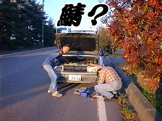 対向車の冷ややかな目を気にしながらはじに寄せて止めてボンネットを開け「あーだ、こーだ」している所に「Min^2の三浦さん」の2CVが通りかかりすかさずHELPモードに移行、一度かかったエンジンも少し走った所でまたストップ(^^; その後30分近く「あーだ、こーだ」したが正常に動作せず寒くなって来たのでMin^2には先に行ってもらって先行到着している人達でキャリアカー出来ている人を呼びに行ってもらいました。