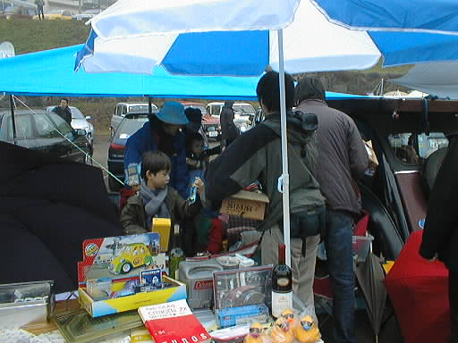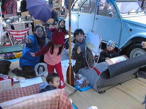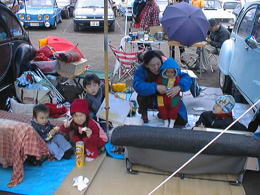 2CV2台で作ったテント(タープか?)の下は託児所状態