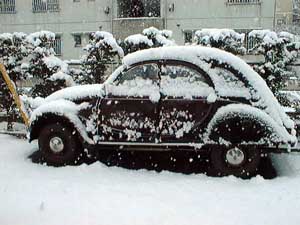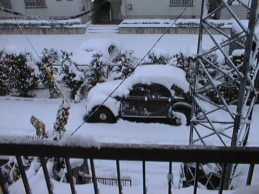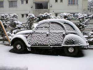 またまた関東は雪です、朝8:30の積雪はこのくらいです、10:30にはこのくらい(後ろの垣根に積もった雪で違いが解るかな?)、11:30で12cmほど2CVのボンネットには積もっています