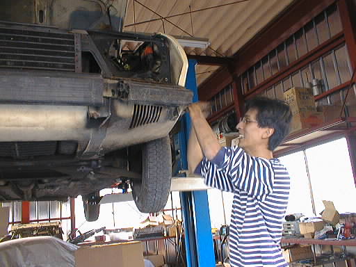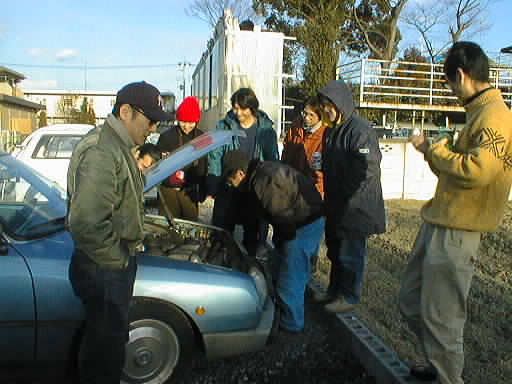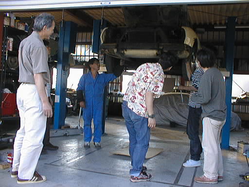 仕方なくホームセンターを見つけて牽引ロープ購入、同行のもう一台のBXで引っ張る事に(トホホ)、マニュアルミッション車なのでたまにギヤを入れてエンジンを回せば車高も下がらずブレーキも効くのでチョット安心(ってエンジン掛からないので安心じゃ無いな)途中数回イグニッションをONにしたりしていましたが20分走った引いた所でエンジンスタート♪その後残り1/3の距離は自走でサルベージ終了、その日の内リフトに乗せてとりあえずエンジン降ろせるようにグリル関係を全部外してしまいました、写真1、写真2(運転お疲れさま)