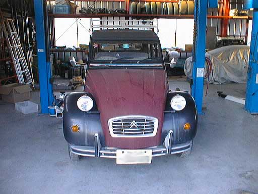 2CVは強くぶつかったつもりでなくても(事故でなくても)フレームに影響が出ます、リフトに上がってる車が有ったので取材です