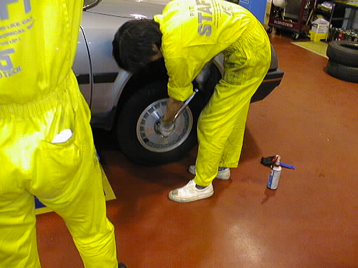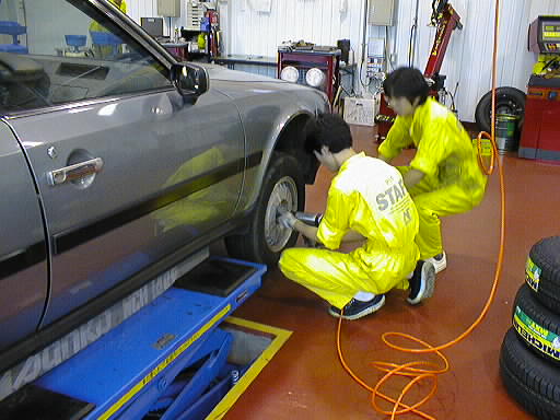 フロントヘビーの鯨に戸惑いながらもリフトしてタイヤを外すスタッフ