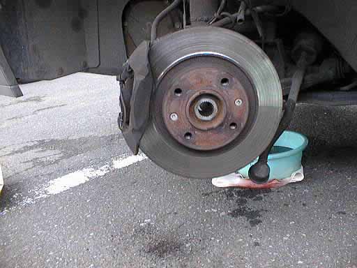 シャフトが抜けているフロントハブ周り、奥のタライはATFを受ける為の物らしい