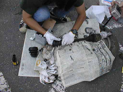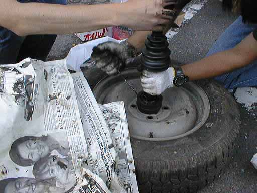 ドライブシャフトを抜く事を考えると張り付け式のブーツがお手軽と思われる