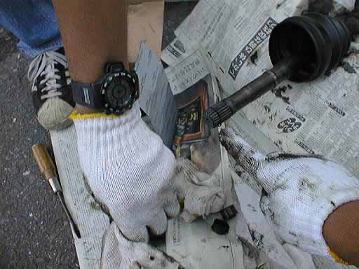 )のシトロエンBXのドライブシャフトのブーツ(左前輪の内側)が切れていたので交換する事になったが実際にシャフトを抜いて用意したブーツを合わせてみると....なんと!合わない!(サイズが「とほほ」らしい)急きょ買い出し部隊?に走ってもらって待っている間ITONAMIの秘密の部品庫(一般には押入と呼ばれているらしい)の奥から発見!雨が降る前に作業を終わらせる為にみんなで協力して何とかシャフトを元に戻した所で雨が...間一髪作業は間に合いました(^_^)