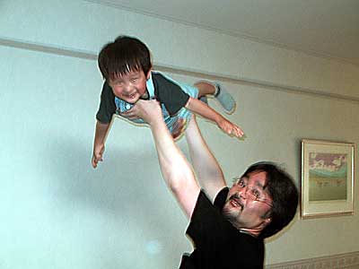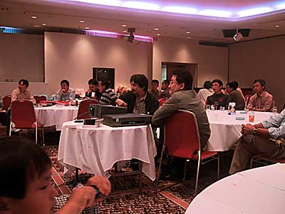 同室3人のBX組は高級車DSM系の雰囲気に付いていけず(笑)、自室でビールを飲み飲み盛り上がりました。しかし、新幹線でたっぷり昼寝した息子は何時になっても寝ず、とうとう加藤氏の荒技の餌食に。しかし、結果はこのとおり大喜び。ありがとうございました(動きが早くてブレちゃってますがご勘弁)。結局、息子が1時半に沈没した後、3時前までBXトークに花が咲いたのでした。 |