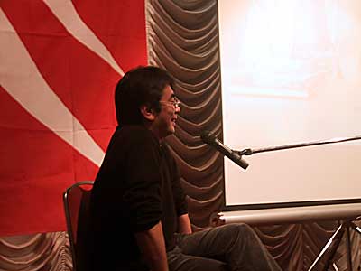 前夜祭は19時から開催されました。このようにヘヘマーク等で彩られ、スクリーンには貴重なVIDEO画像が流されていました。バイキング形式の豪華夕食の後、21時から懇親会としてDSMとBX20の主催者によるトーク・ショウが行われました。楢林さんならではの力の抜けたトーク(失礼)に会場は沸いていました。 |