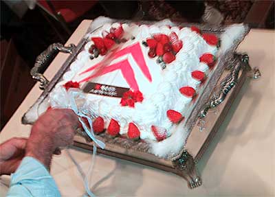 会場で山田氏によりカットされた特製ケーキ。何と勤続40周年記念だったそうです。この後、小分けにされたケーキを全員でいただきました。甘すぎず美味しかったです。 |
