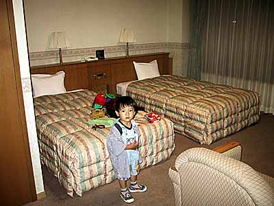 泊まったのはホテル・ノースウイング。高級リゾート・ホテルで、写っているのは部屋の半分。撮影者の背後にもう2台ベッドがあり、右側には応接セットがある広さです。洗面台は2つもあり、浴室はちゃんと洗い場の付いたタイプでした。 我々はBX16Vのnal氏、BX16TRSの加藤氏と同室でした。弱冠3歳にしてこのベッドを独占するとは贅沢な奴です。 |