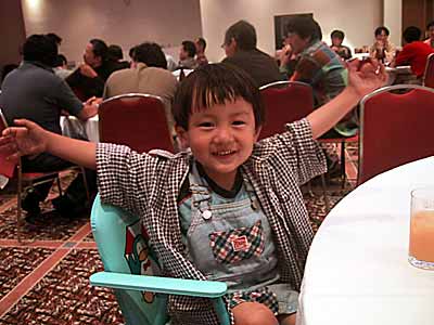 トークでは退屈するかと思ったうちの息子、パーティの雰囲気がお気に召したのかこのとおり大はしゃぎで、他の子供さんがたが夕食会のみで懇親会には来られなかったのに、ずっと席を占めていました(^^; |