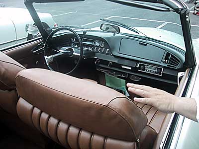 DSデカポタブルの運転席。分厚いソファのようなシートに華奢なステアリング。ラジオが助手席前に付いてるのは、運転手よりお客さんを大事にするってことでしょうか。後席は前の半分くらいのスペースしかありませんが、何とか4人乗れる程度の広さでした。何とも贅沢な車です。 |
