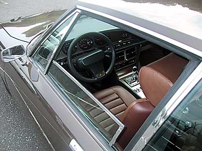 ブラウン・メタリックのSMの運転席。開けた窓にもクロームの縁取りが付いていることに注意。また、クロームといえば、凝った造りのシフト・レヴァ周りもかっこいいですね。 |