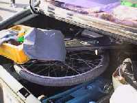 サーブのトランクに収まった、「原付自転車」。ほんまにナンバー取るのだろうか。ちなみにエンジンはペダル前方にある。 |