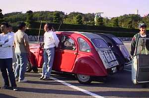 榊氏のレイド仕様2CVと谷口@佐賀氏のBX(切れてゴメン)。車内をのぞき込んでいるのは左こめたに@DAC House氏(大阪の2CVショップだそうな)、右おかの氏。 |