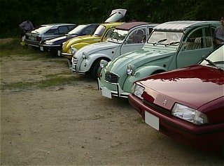 結局話が尽きず、時間になってもウダウダとしていたうえ、工場長が道を間違えると言う事態を招き、会場には大幅に遅れました(^^; これはようやく駐車場に揃ったところ。Xantiaの特徴的なハッチゲートが写っています。また、BXのボンネットがきれいに写っています。この、リブ無しのつるんとした造形は、一見大したこと無さそうですが、実はすごくコストがかかってるはずです。 |