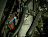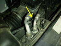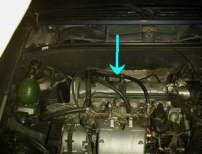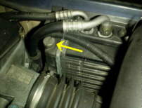 前述のようにドレン・ボルトはないのですが、ラジエータの、進行方向に向かって左端の下部後方に、タンクから出てどこにも行かずにまたもどる太さ1cm、長さ15cmくらいの太さのホースがあります(矢印。右側の銀色はラジエータのコア)。それがどうもドレン・ホースらしいです。クリップを外して抜くと水が出てきます。クリップはネジで締まる奴で、しかもエアコンのホースの近所なのでひどく廻しにくいです。このとき、キャップはもちろん、ブリード・スクリュ(後述)も全てゆるめておかないと、出てこない部分がうんとあります。ヒータ・ユニット内部からの排出をよくするためには、エアコンの温度調整を最暖にしておくとなお良いらしいです。