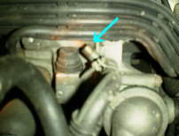 サーモスタット(丸い銀色)の斜め上。アーレンキーをハイテンションコードの裏側に通して廻す。右は拡大図。(ピンぼけですまぬ) |