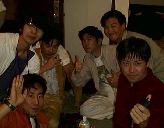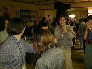 会場前方では、一同踊り狂っていた。踊っていないひとは車座になって酔い狂っていた。手拍子を打っているのは「おぉ」こと尾崎@AX氏。 |