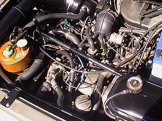 これがGS Birotorのエンジン・ルーム。ちょっと見ただけではどこにエンジンがあるのかさえ判らない。しかし、どうも一番手前(車両先端)に横置きされているらしい(後日発見したが、この写真によると、エンジンとトランスミッションは常識どおり直列につながっていた)。 ということは、ギアボックスまで異なるということだ。GSはフラット4縦置きだから当然REでもそうかと思っていた。後にオーナーの小幡さんに聞いたところによると、トランスミッションはCXのものを流用しているそうだ。しかし、REはエキセントリック・シャフトの位置が高いために、共用させるためにはエンジン位置を下げるか、ギア・ボックスを上げるかしなければならない(MAZDAのレース用REはこの理由によりドライ・サンプとしてエンジン位置を下げている)。どうなってるのだろうか。 なお、補機類は右端に見えるバッテリ(もちろんGS製!)の下にあるそうである。 |