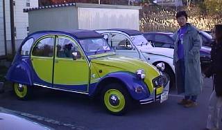 同宿だった山川さんと彼の2CV Charleston。MICHELINカラーにリペイントされている。何でも、もう1台買えるくらいのカネをつぎ込んだそうで、なるほど極上の1台である。その甲斐あって、会場では格好の写真&子供の写生の対象になっていた。向こうにちらりと見えるのはMin^2の2CV。画面右端はMin^2の連れ「ぼーしや」。 |
