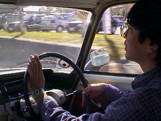 颯爽とDSを転がす楢林氏。このクルマは英国仕様らしく、RHDでマニュアルのコラム・シフトである。 氏はこのあと、気軽にも(大胆ともいう)工場長にステアリングを貸してくれた。辺りを一回りしたが、この大きさで、しかもFWDだというのに、以外に小廻りがきいた。確かに、事前に思うような、とんでもなく乗りにくいクルマではない(まあ、特殊車ではないのだから当たり前だが)。ただ、例のブレーキ・「ボタン」は本当に過敏で、普段ハイドロに乗り慣れていない人がスムーズなブレーキングをすることは不可能であろう。 このクルマでFBM会場周辺を走ると、皆がこっちを向いて「オッ」という口をしたり、カメラを構えたりする。今を去る8年前、Roadsterがまだ珍しかった頃をなぜか思い出していた工場長であった。 |