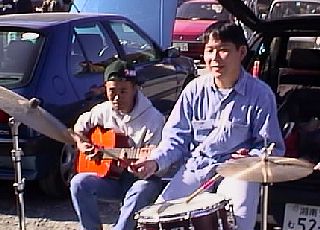 なぜか会場にドラム・セットを持ってきたjack。Min^2の後輩とのこと。 これは、2人でジャム・セッションをしているところ。この直前までMin^2は流しのオッちゃんと化し、演歌を口ずさんでいた。 |