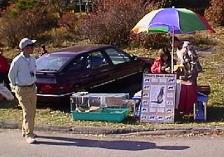 FBM会場入り口前でフェレットを展示即売していたぐにぐにわーるど!の「どーしーぼー」こと、築谷氏と奥方(パラソル下)。フェレットはイタチをかわいくしたような動物である。 |