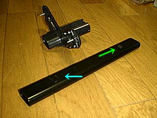 これは抜いた部品。左側が上方向になります。 写真の青矢印の位置に約1mm厚のプレートが張り付けてあって、これがカラーに引っかかり、抜け防止になっています。ですから足を抜くとカラーの部品もろとも抜けます。なお、元々前席に付いていた方はこれとは違い、パイプの一部を切り欠いて爪を出した形状になっていました。 緑の矢印は内部に仕込まれたプラスティック製の爪。バネになっていて差込穴の中に設けられたラッチと噛み合って高さ調整に使います。 |