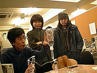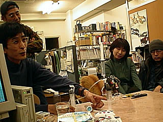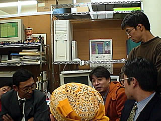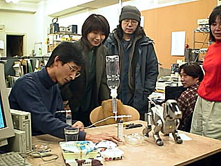 これは最近盛り上がっていた、ミドル・ポジションで乗り心地が固くなる現象の解明のため楢林氏が作ったモデルで実験をする「じゅん」。見守るのは左から「r」、「木各」、AIBO@「プリザ」、社員氏、「狂」妻(切れててゴメンナサイ)。AIBOの実物は初めて見ましたがなるほどうまくできていて感心しました。 |
