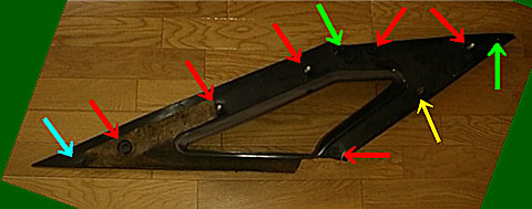 これが外したトリムの裏側です。大きいのでカメラに収まらなかったので枠が斜めになってますがご勘弁を。 矢印の部分で留まっています。緑のものが表側から見えるビス(2ヶ所)です。青はL字形フックになっていますので、最後にトリム全体を前にスライドさせて抜きましょう。 |