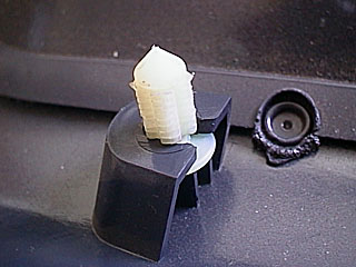 赤い矢印の部分(写真では何カ所か脱落していますが)はこのファスナで留まっています。 ボディ側の穴に押し込んであるだけですので、場所の見当を付けて引っ張ると抜けます。気になるのであれば再装着時に新品にする方がいいかもしれません。 |