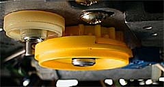 例のコンソールですが、手前の部分がご覧のとおり開くようになっています。写真の下が車両前方です。横に長い円筒形のものがモータで、上側のダイキャスト製の部分がギア・ユニット。